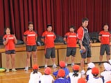 10月11日(木)鈴鹿市立長太小学校にてタグラグビー指導講習会を実施しました。対象は5年生3クラス。総勢90名への指導ということもあり、指導にあたる選手・スタッフも気合十分。まずは、鎌田(秀)選手・小西選手/西垣選手・ポンギ選手/森川選手・安藤副務の3ペアに分かれ、1クラスずつを指導。それぞれ違った指導方法が行われ、生徒たちも非常に楽しそうに指導を受けていました。最後に行われた生徒vs選手との試合では、白熱した試合が繰り広げられ、最初はルールがわからなかった生徒たちも笑顔いっぱいに満足げな表情で、講習会を終了しました。