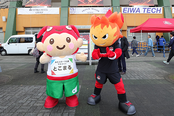選手、MCタイキ、笹井さん、フレイミーズ、ヒートくん、とこまるがご挨拶