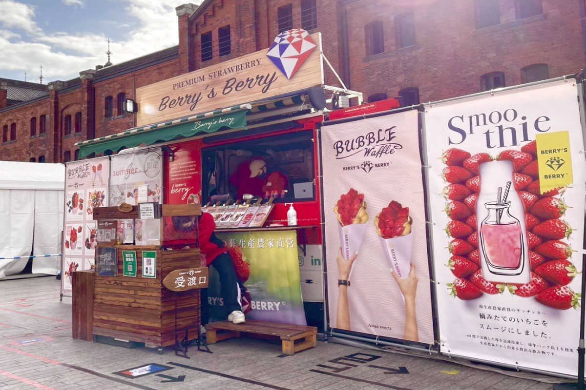 苺農家生産農家の苺のスイーツ。サクサク、もちもちの焼き立てのバブルワッフルに完熟の苺を贅沢に使った、苺農家ならではのスイーツ