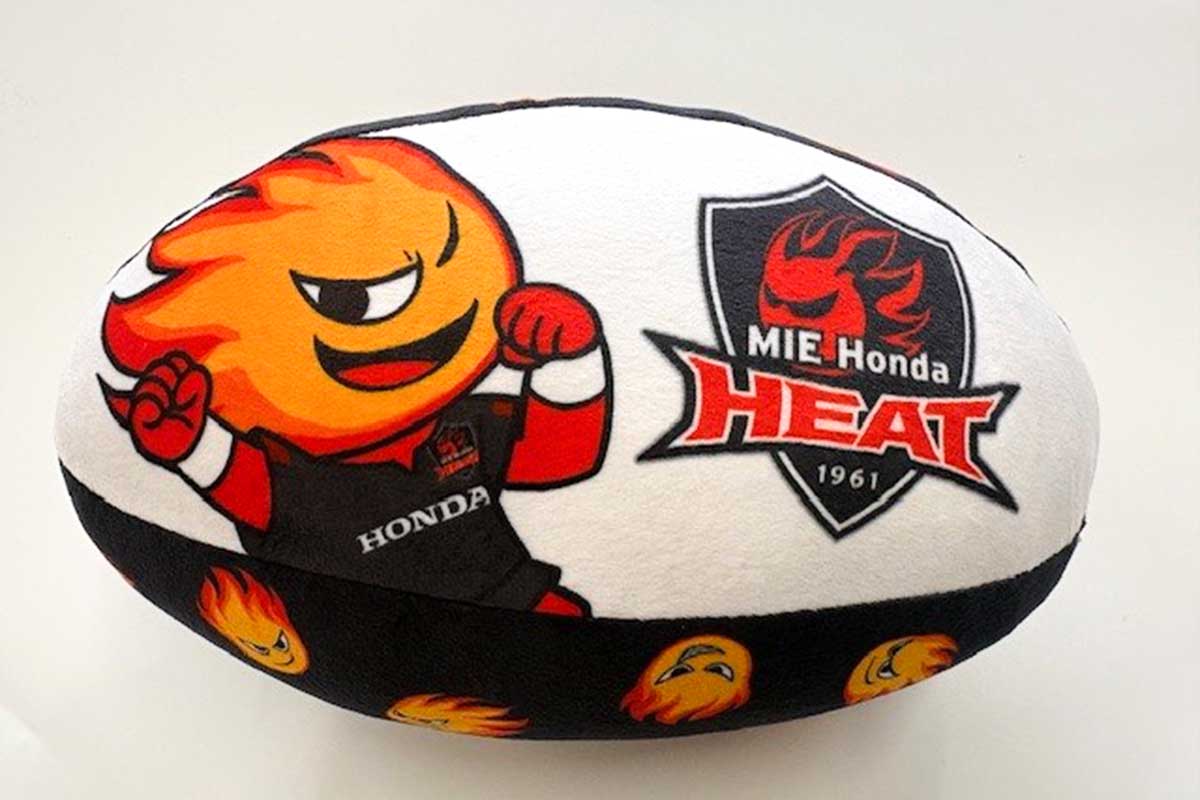 リーグワン天気予報ウェザーニュースでも大活躍だったヒートくんがデザインされたラグビーボール型ミニクッションボールが登場!!