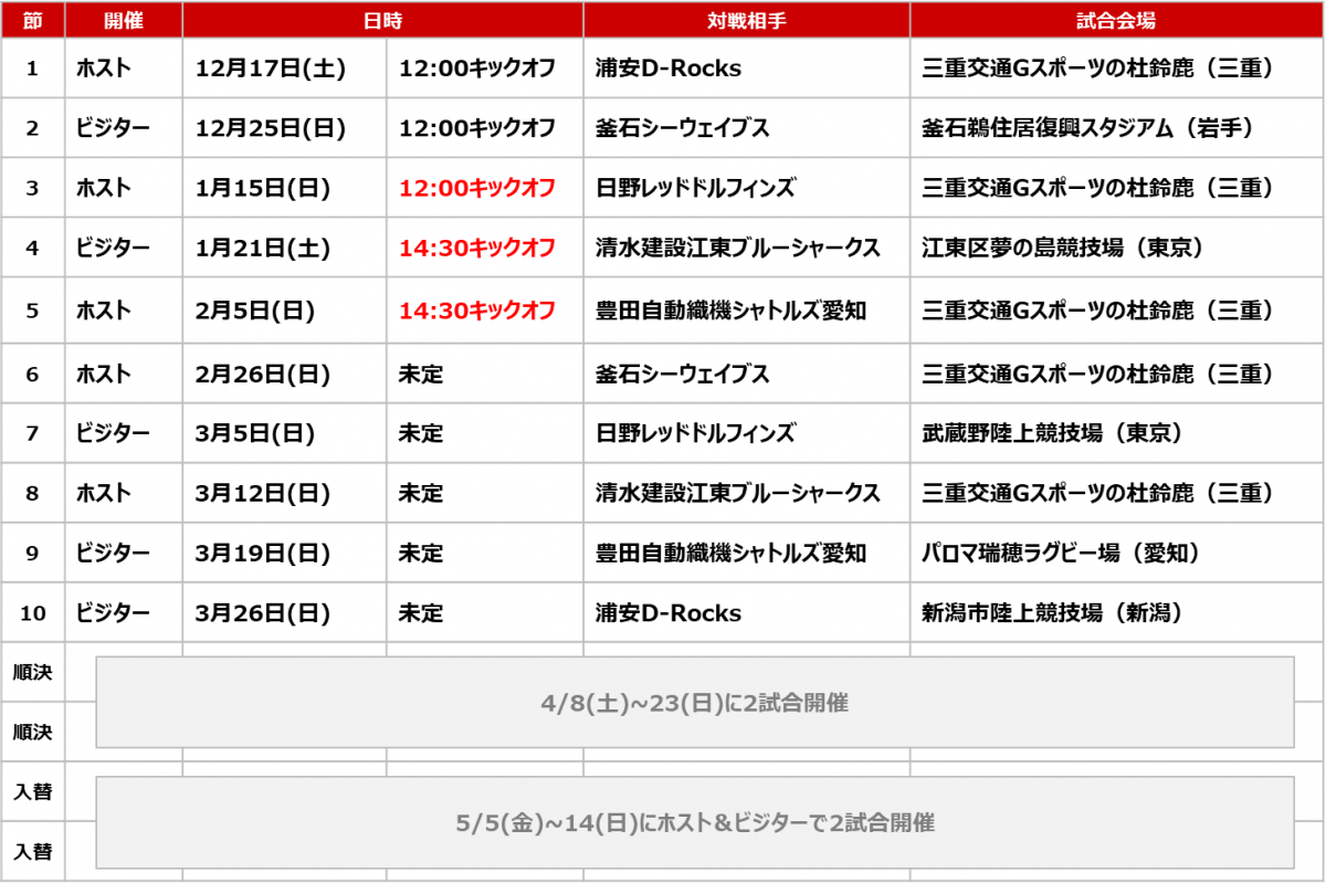 NTTリーグワン2022-23 三重ホンダヒート試合日程