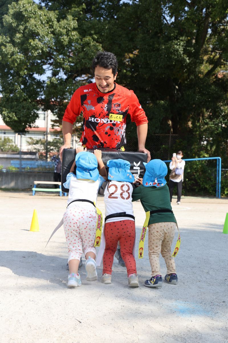 タックルゲームでは、園児達のパワーに、選手らはビックリ!