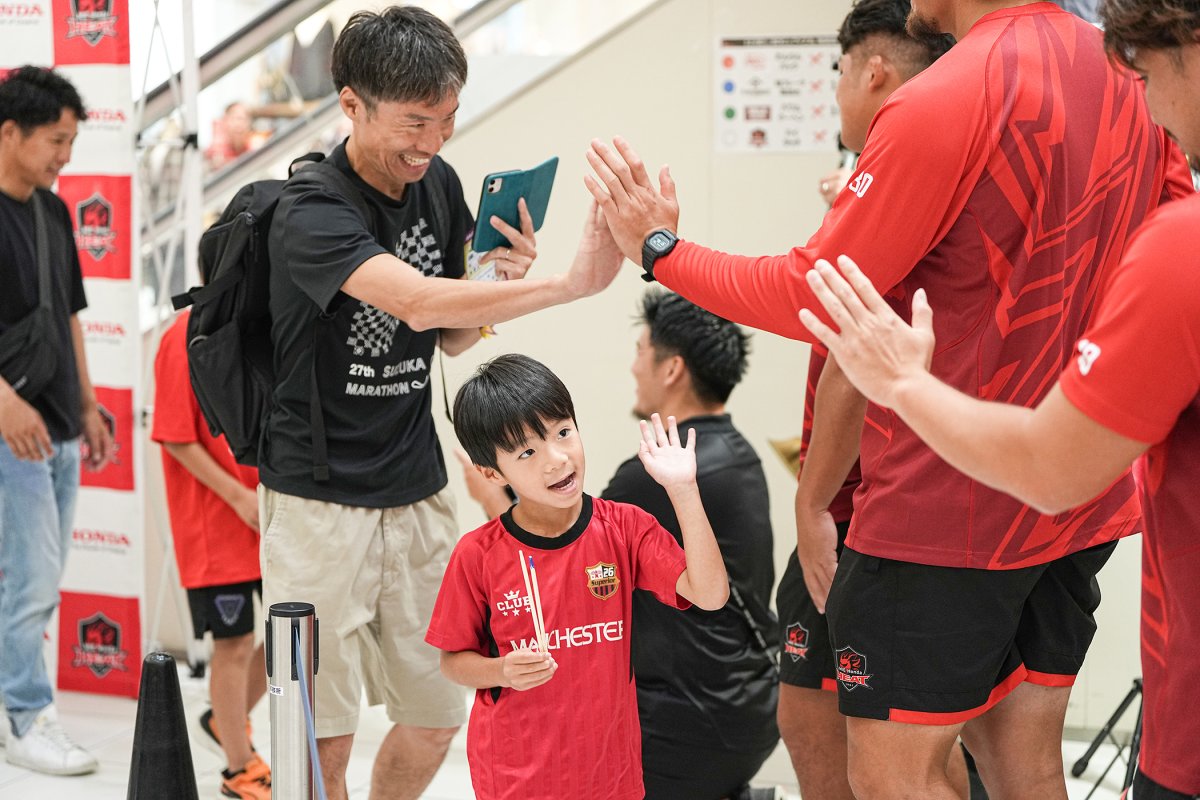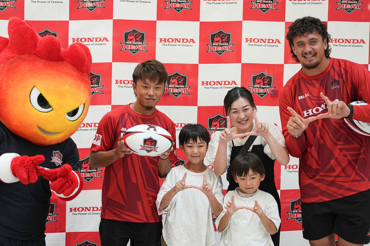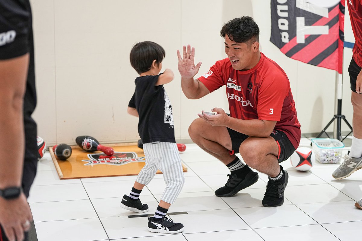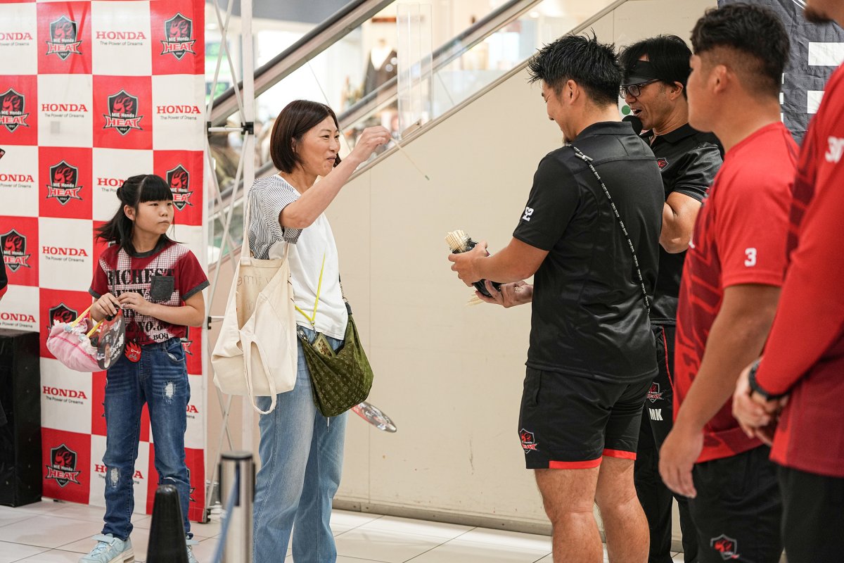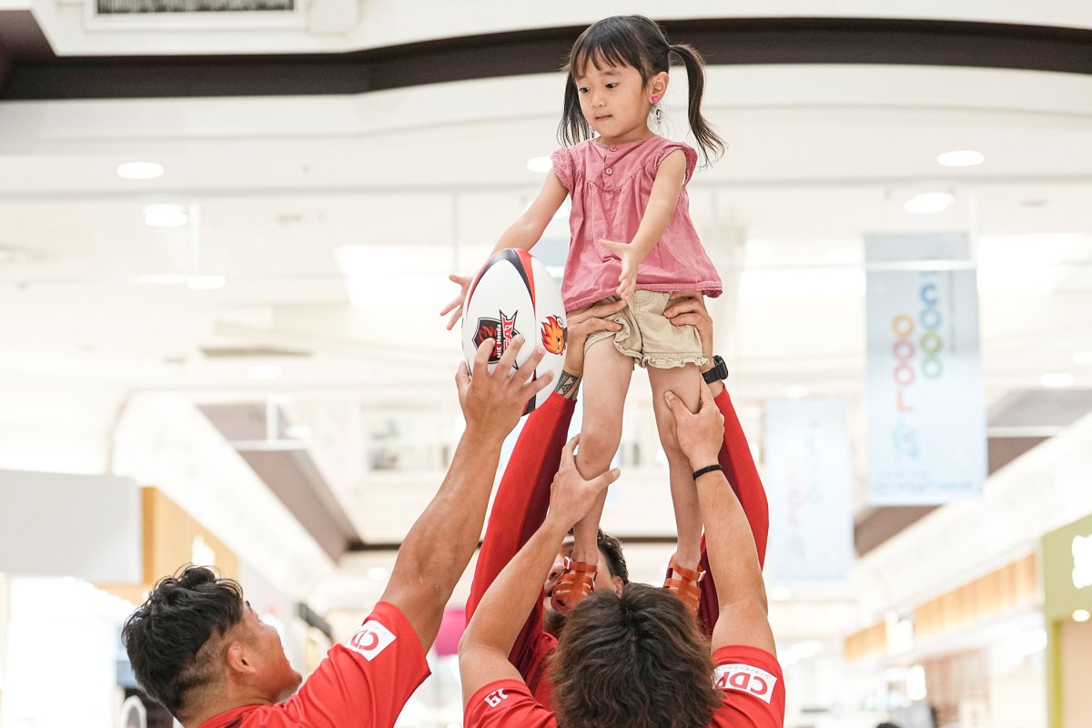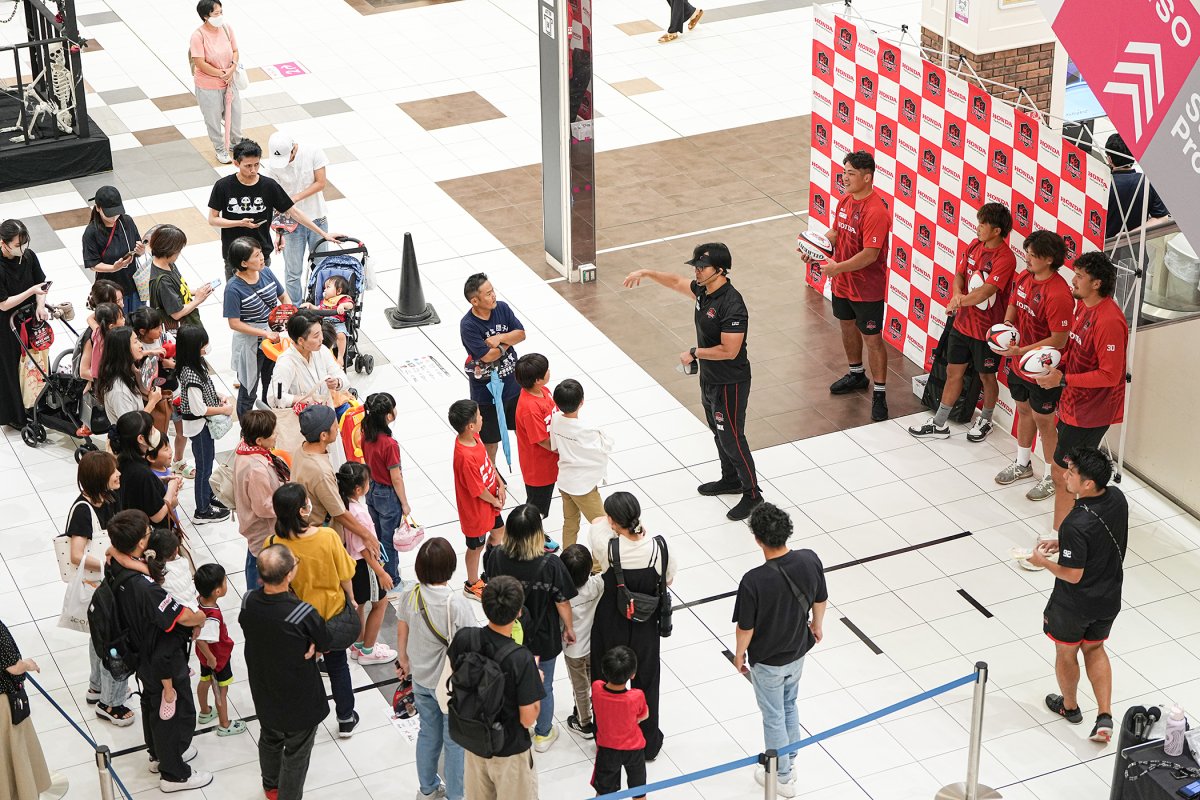 コナー・ウィホンギ選手、當眞 慶選手、土永 雷選手、ヒートくん、そして急遽山田 生真選手が参加し、記念撮影や腕相撲、ラグビー体験(ラグビーボールボーリング)などを実施し、多くのお客様にご参加いただきました!