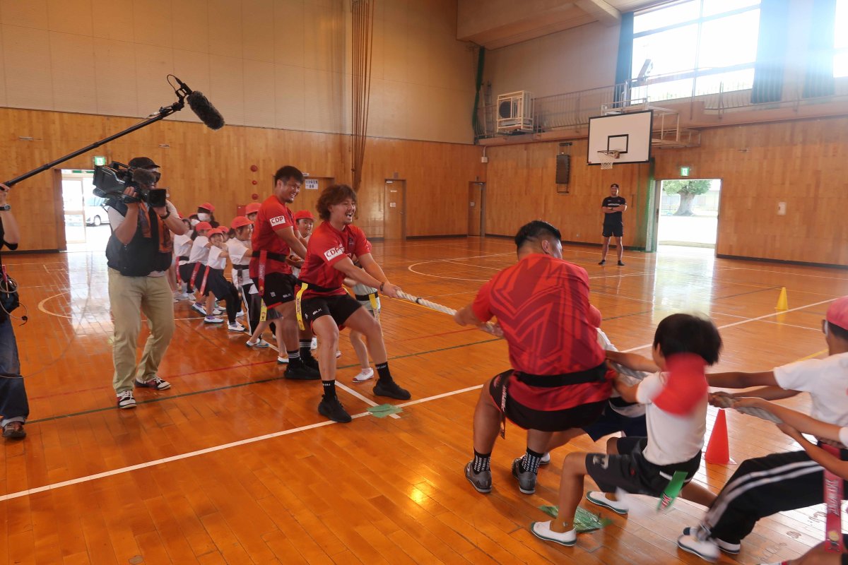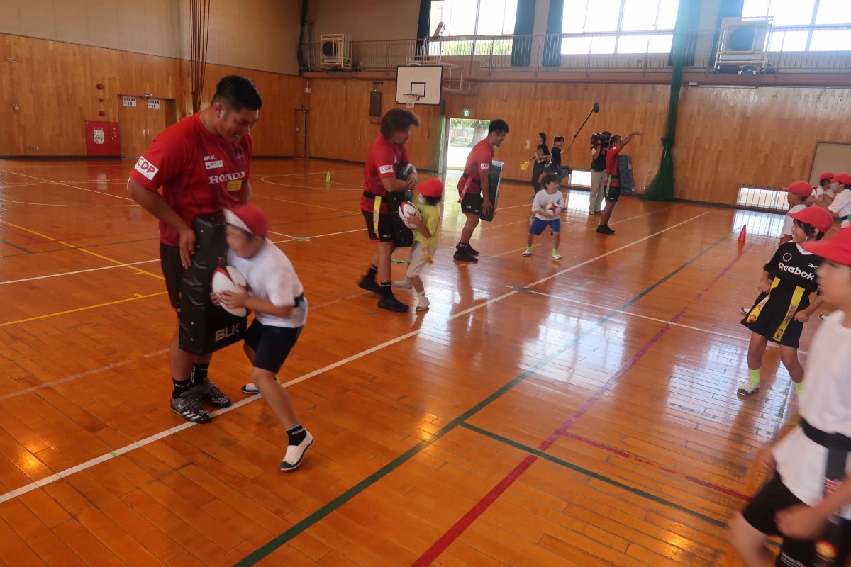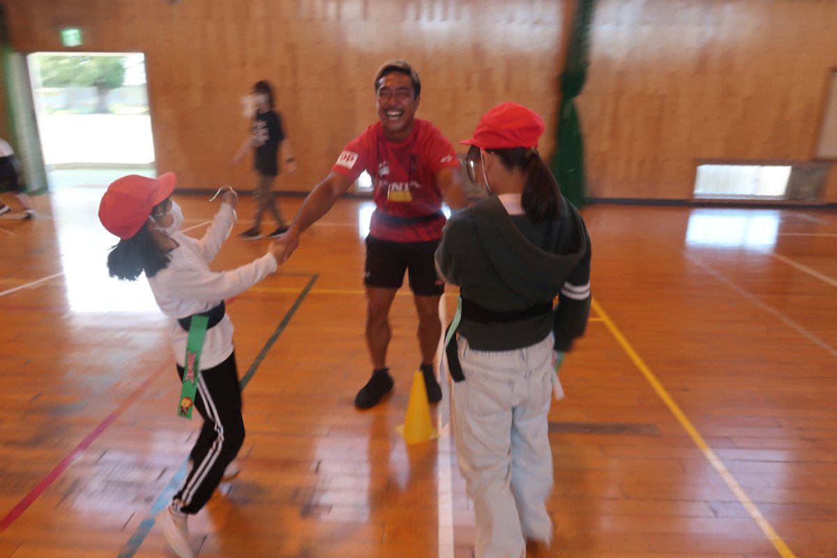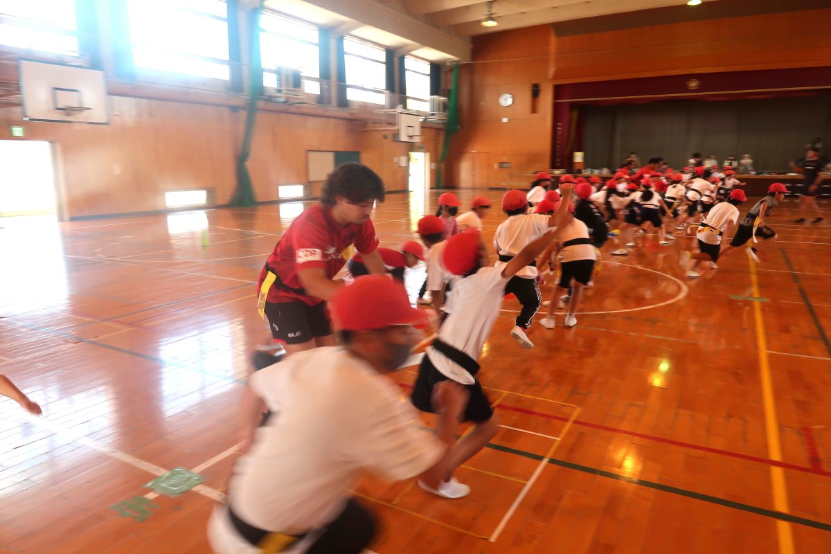 ラグビーを通じたゲームをたくさん行い、チームワークの大切さを学んで頂きました。