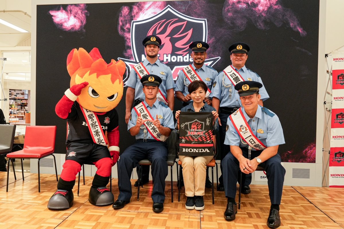 平野 叶翔、中尾 隼太、北條 拓郎、ツポウ テビタ、マティウス・バッソン、ヒートくんが、鈴鹿警察署 辻 幸保 署長より一日警察署長に任命されました。