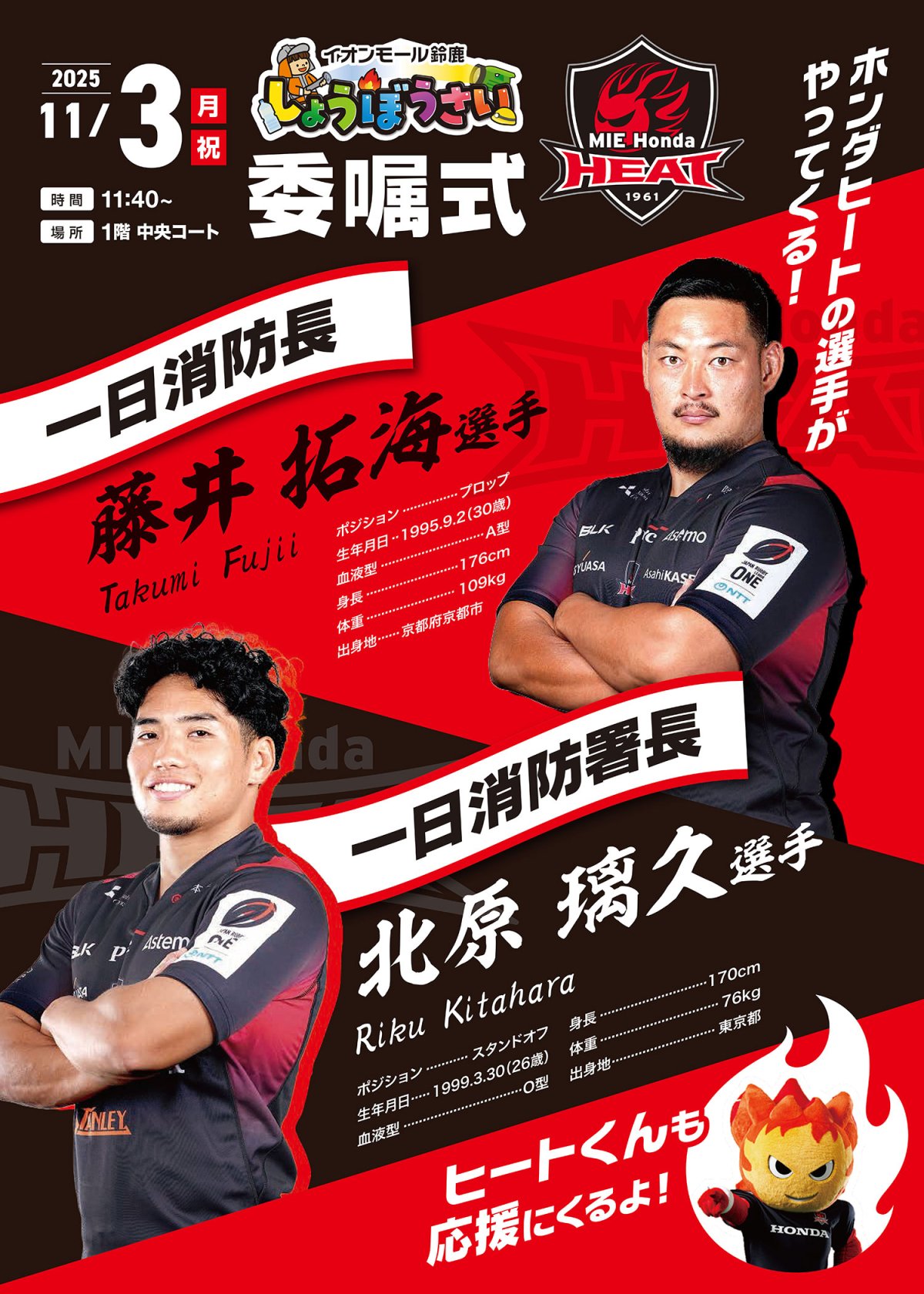 三重ホンダヒートは昨シーズン、鈴鹿市消防本部の啓発ポスターに起用いただくなど、地域の防災啓発活動に協力してまいりました。これらの取り組みが高く評価され、今回の任命に至りました。