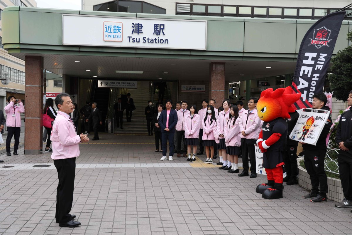 本活動には三重県の一見知事や津市の高校生も参加、駅を利用される皆さまに"いじめ防止"が書かれた啓発グッズをお渡ししました。