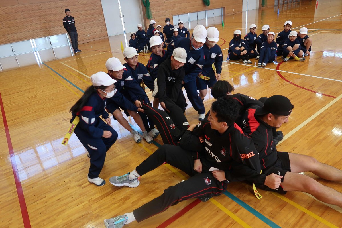 ①HONDAヒートの先生方と綱引き勝負をしたのが楽しかったです。クラスのみんなは全員大切な仲間で、協力することの大切さを学ぶことができました。