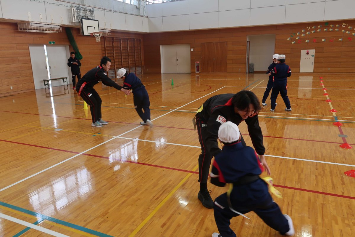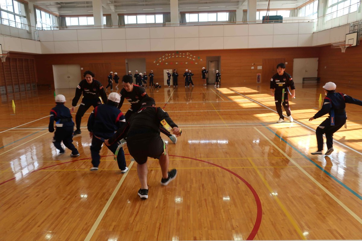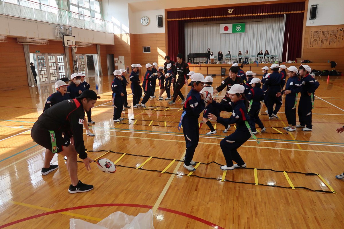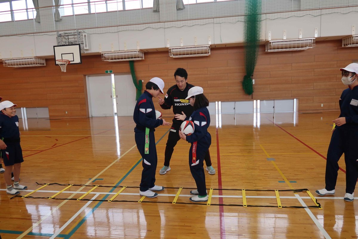 ラグビーを通じたゲームをたくさん行い、チームワークの大切さを学んで頂きました。