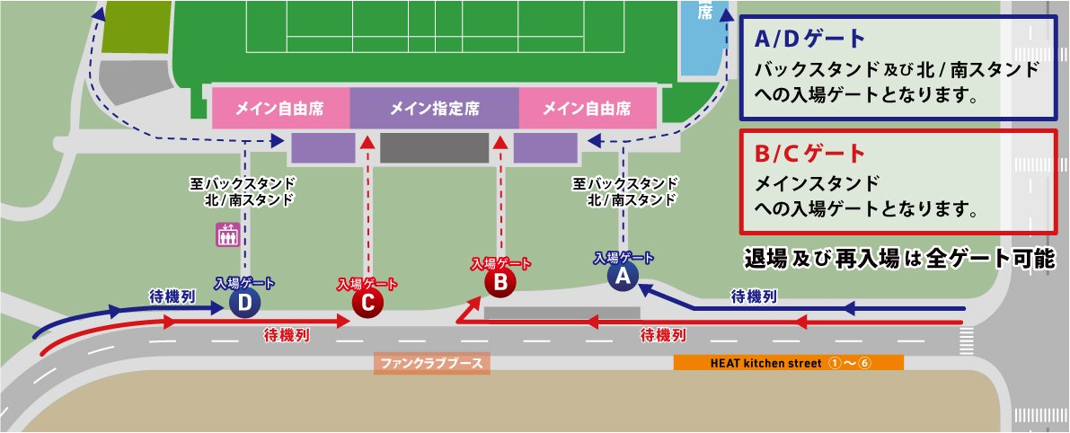 バックスタンド及び北/南スタンドへの入場ゲートとなります。上記地図に記載されている待機列の矢印方向にお並びください。