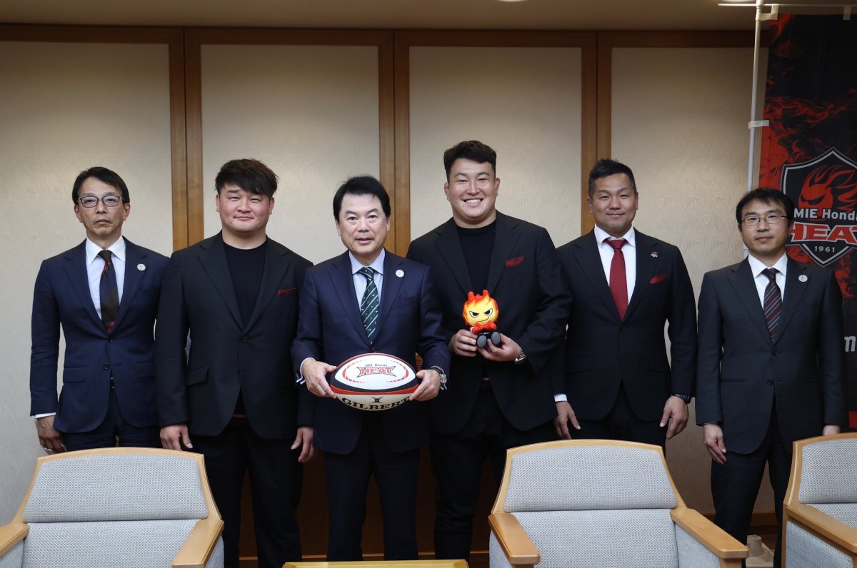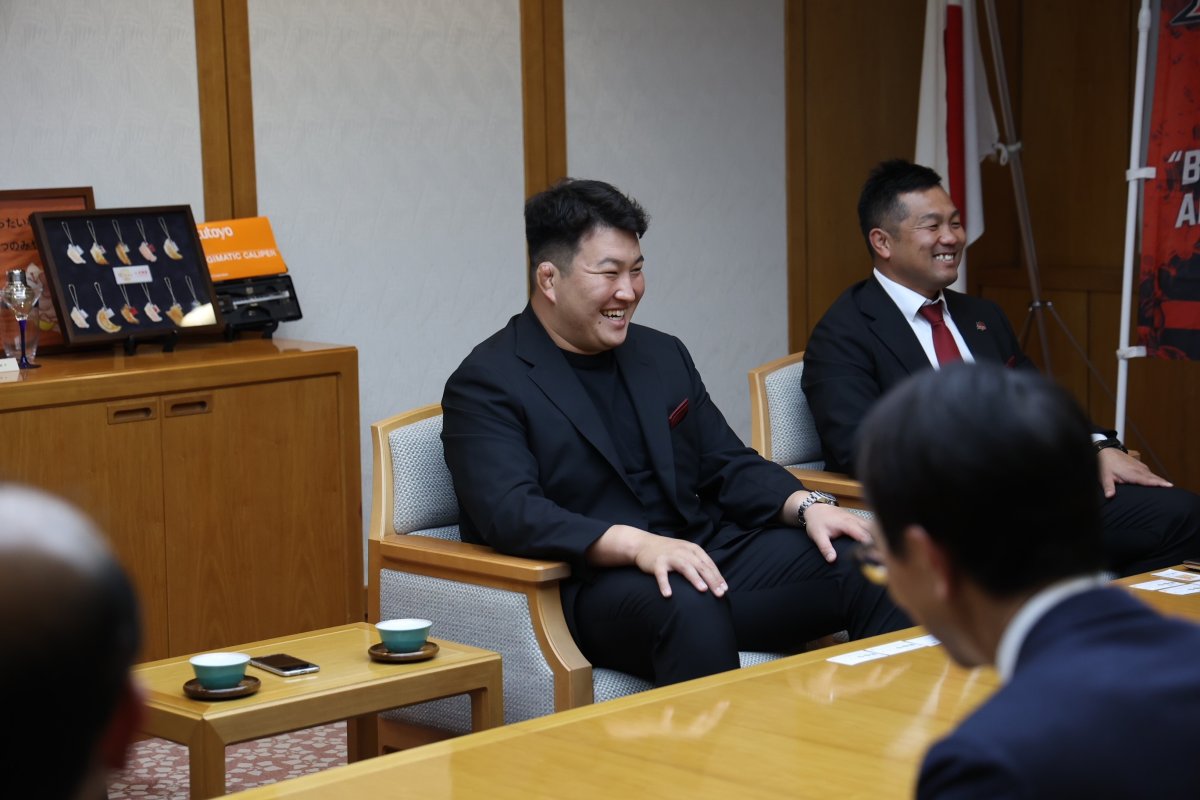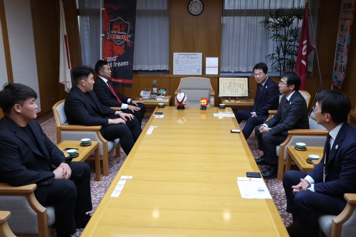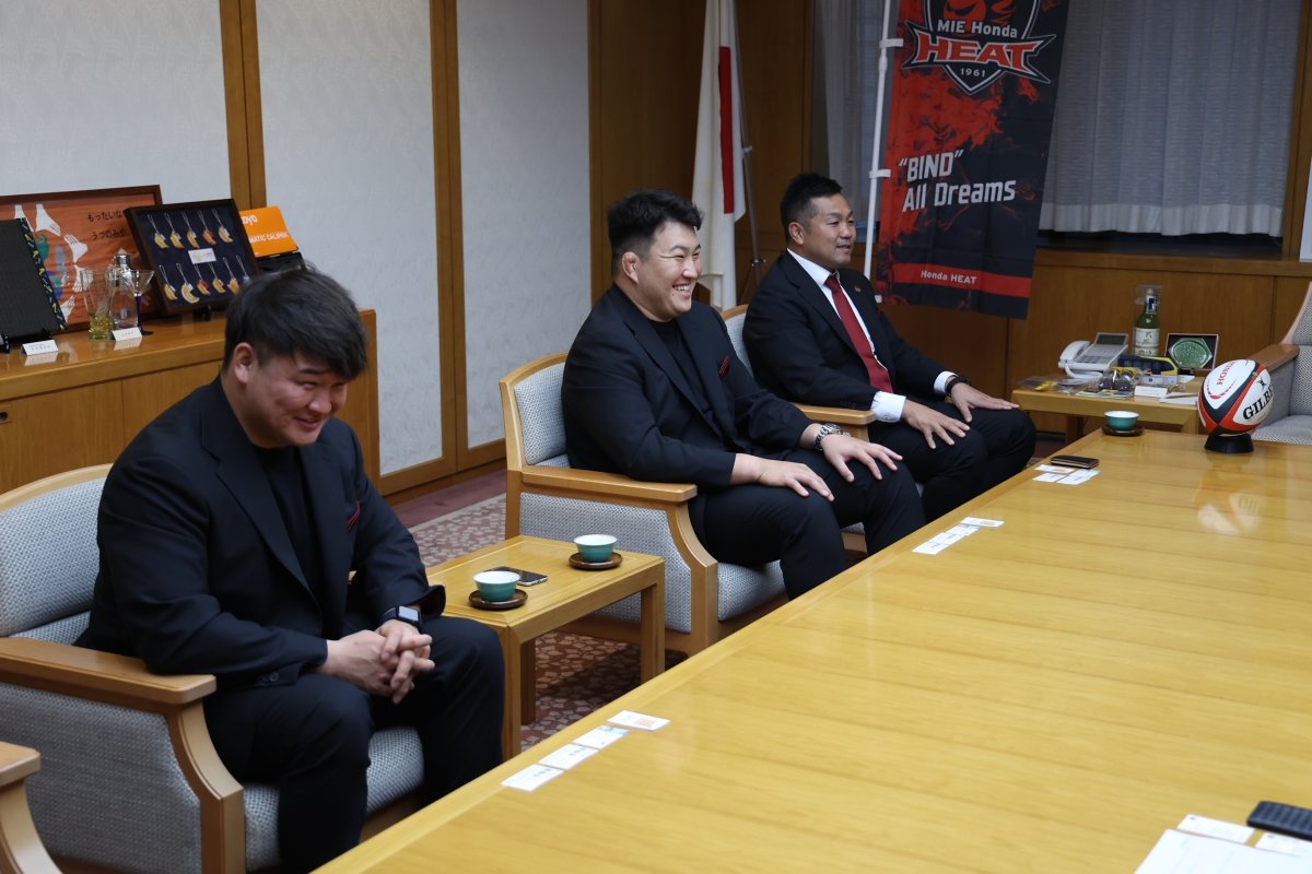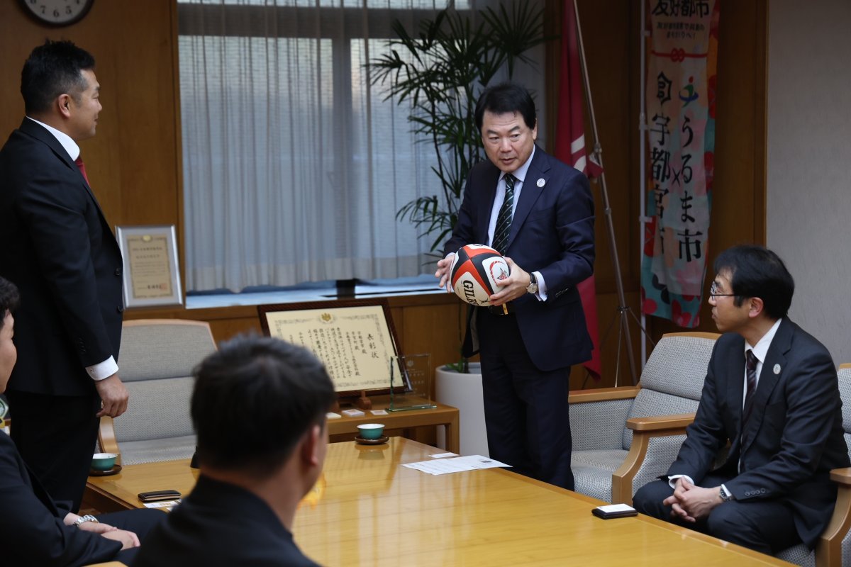 佐藤市長からは、「ヒートが来てくれて嬉しい。やはり“生で観る、やってみる” ことが大事であり、ヒート授業を通じて子どもたちがラグビーに触れられるのは楽しみです。栃木では、皆さんの予想以上にファンが増えると思いますよ。また、宇都宮牛や栃木和牛など、美味しい食も多く、選手の力の源になるはずです。」と温かいお言葉をいただきました。