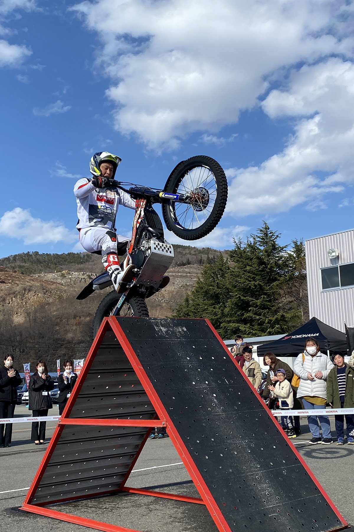 世界で活躍するトライアルライダーが数々のテクニックを駆使し、イベント広場に設置した障害物コースやスタジアムのメインスタンド通路を走破します。